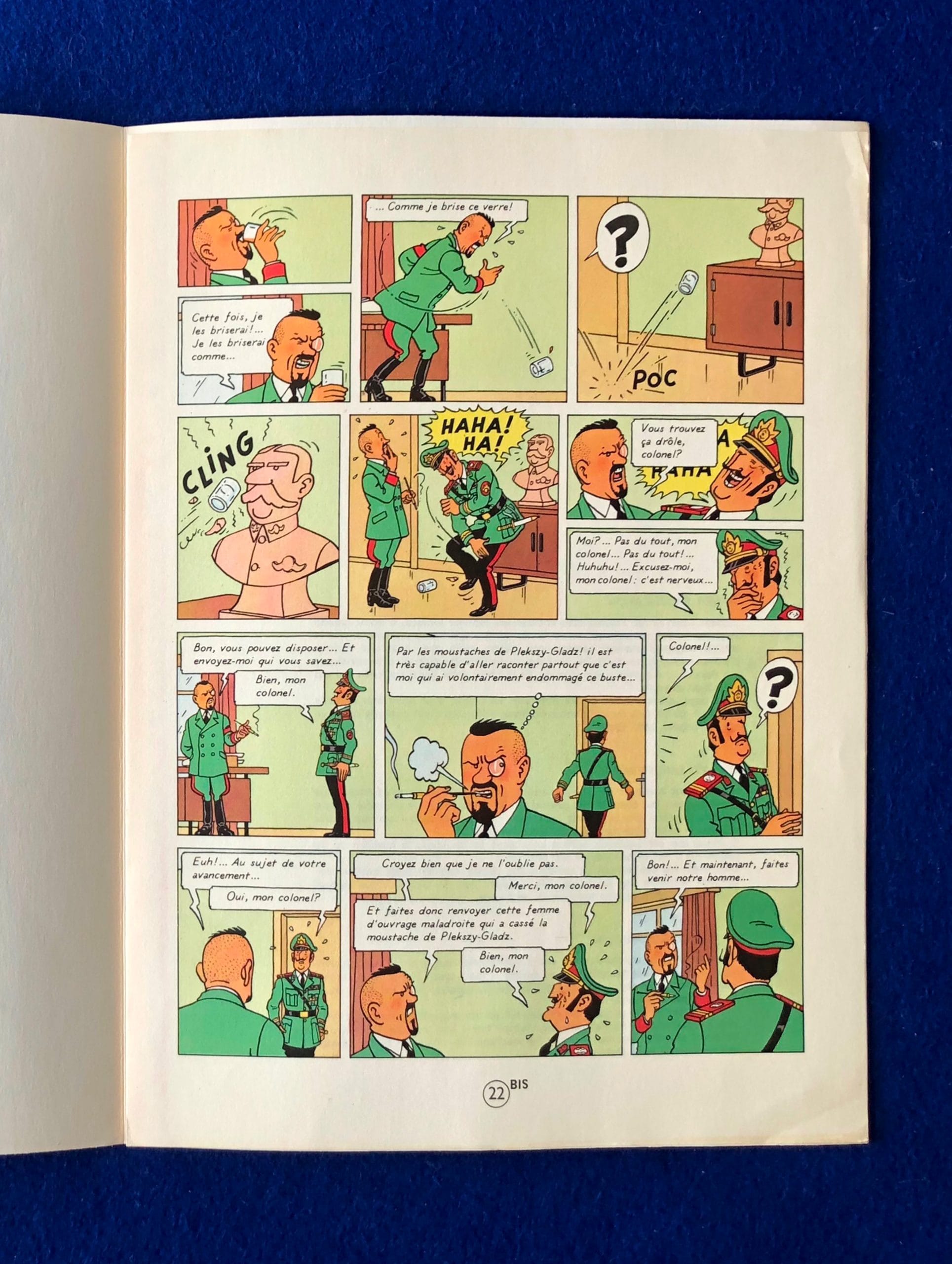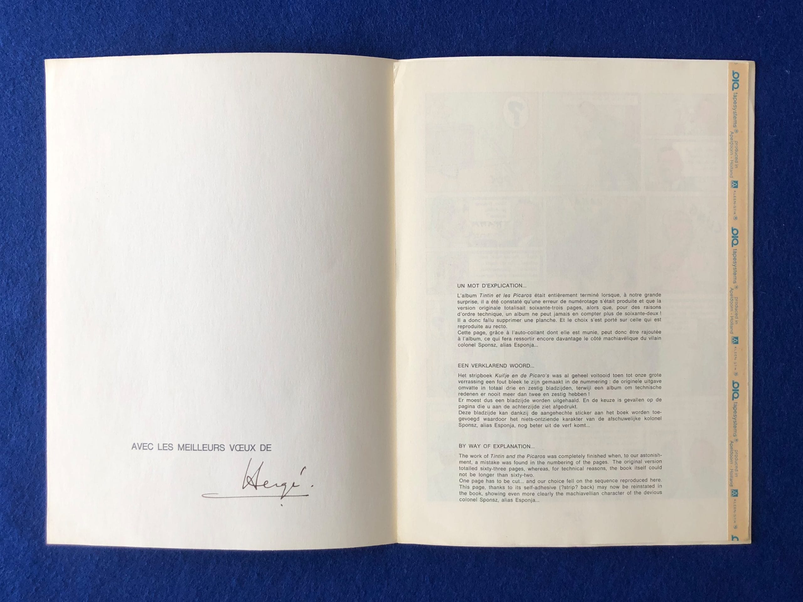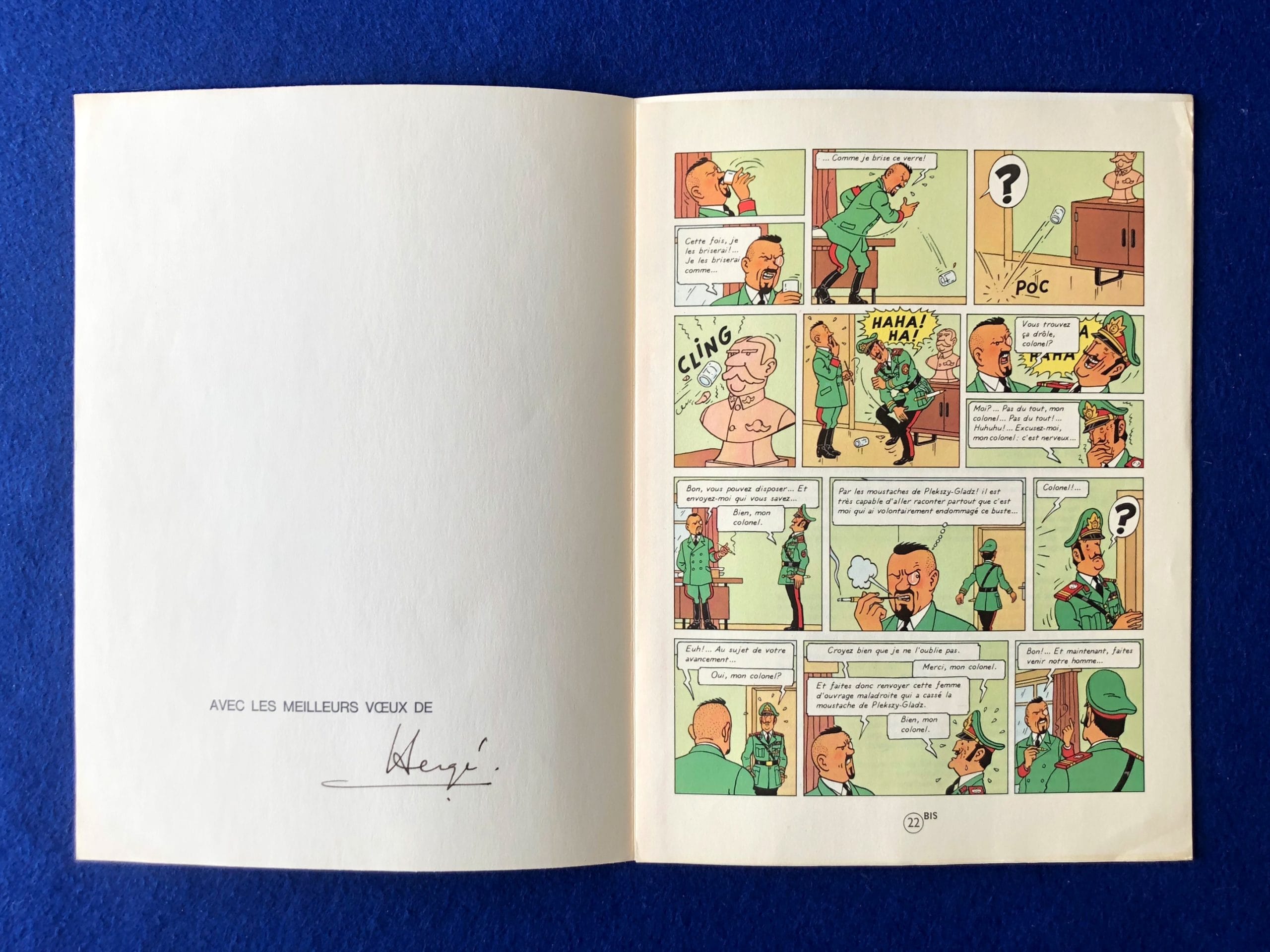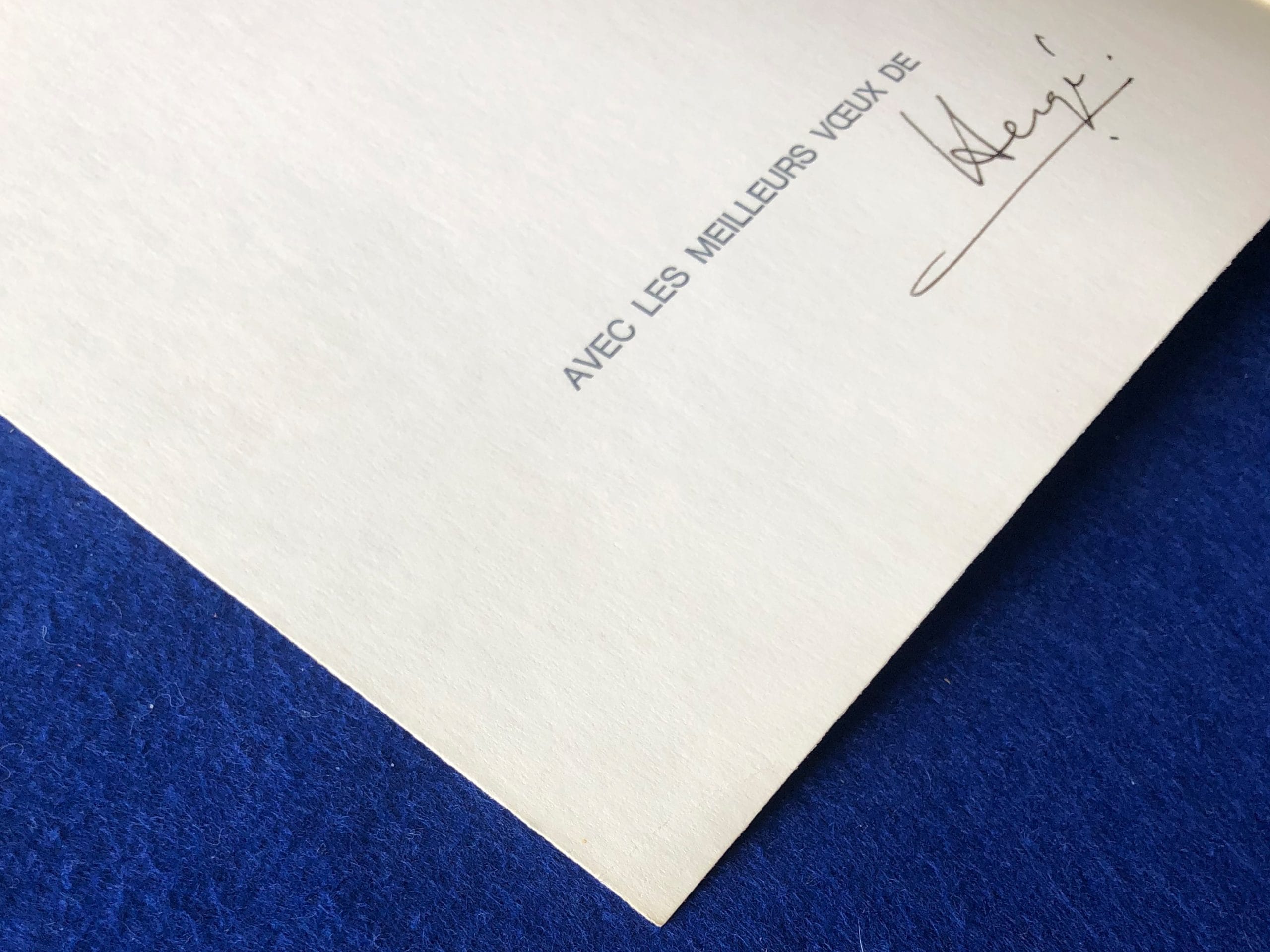 Sublime carte de vœux de 1978 signée de la main d’Hergé avec la reproduction de la planche inédite 22bis avec sa bande autocollante.