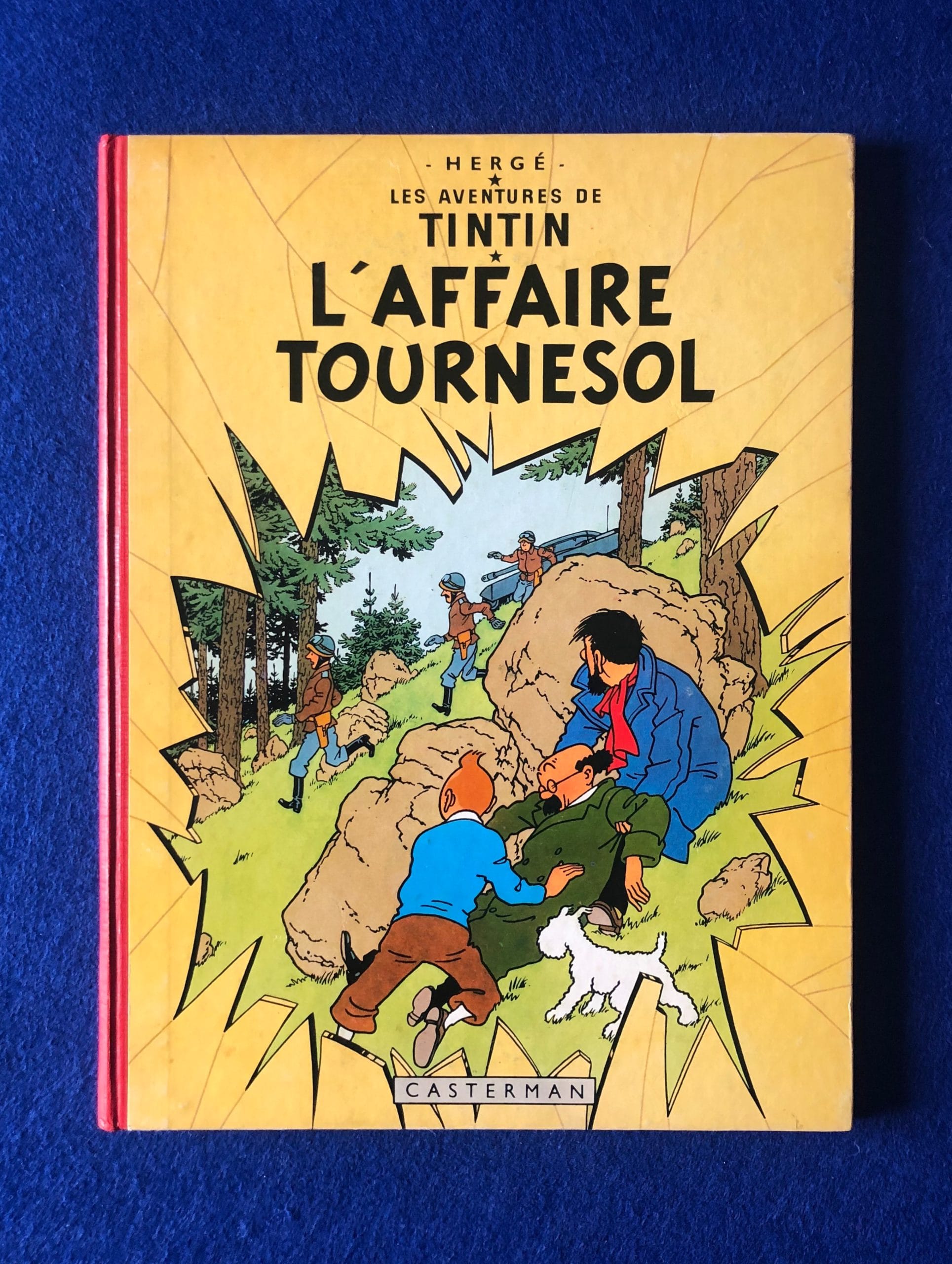 Réédition de L’Affaire Tournesol de 1964, 4ème plat B35, Dos rouge, Pages de garde bleu claire, Imprimé en Belgique.