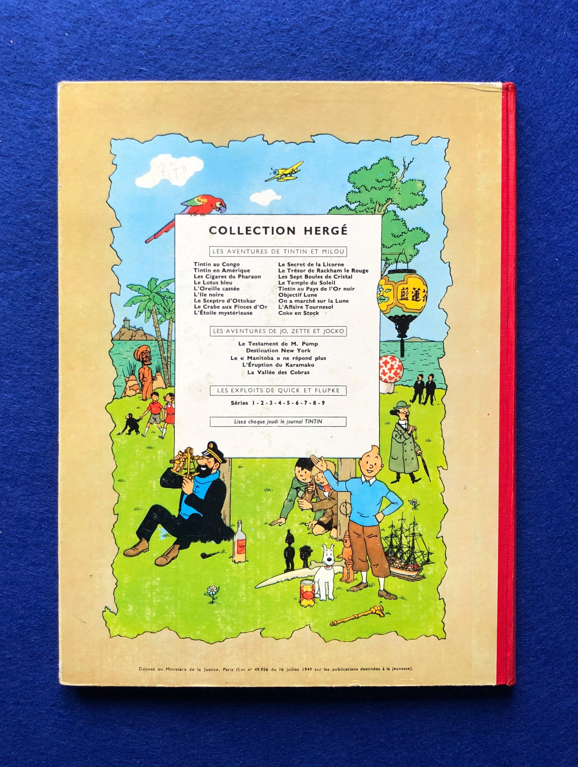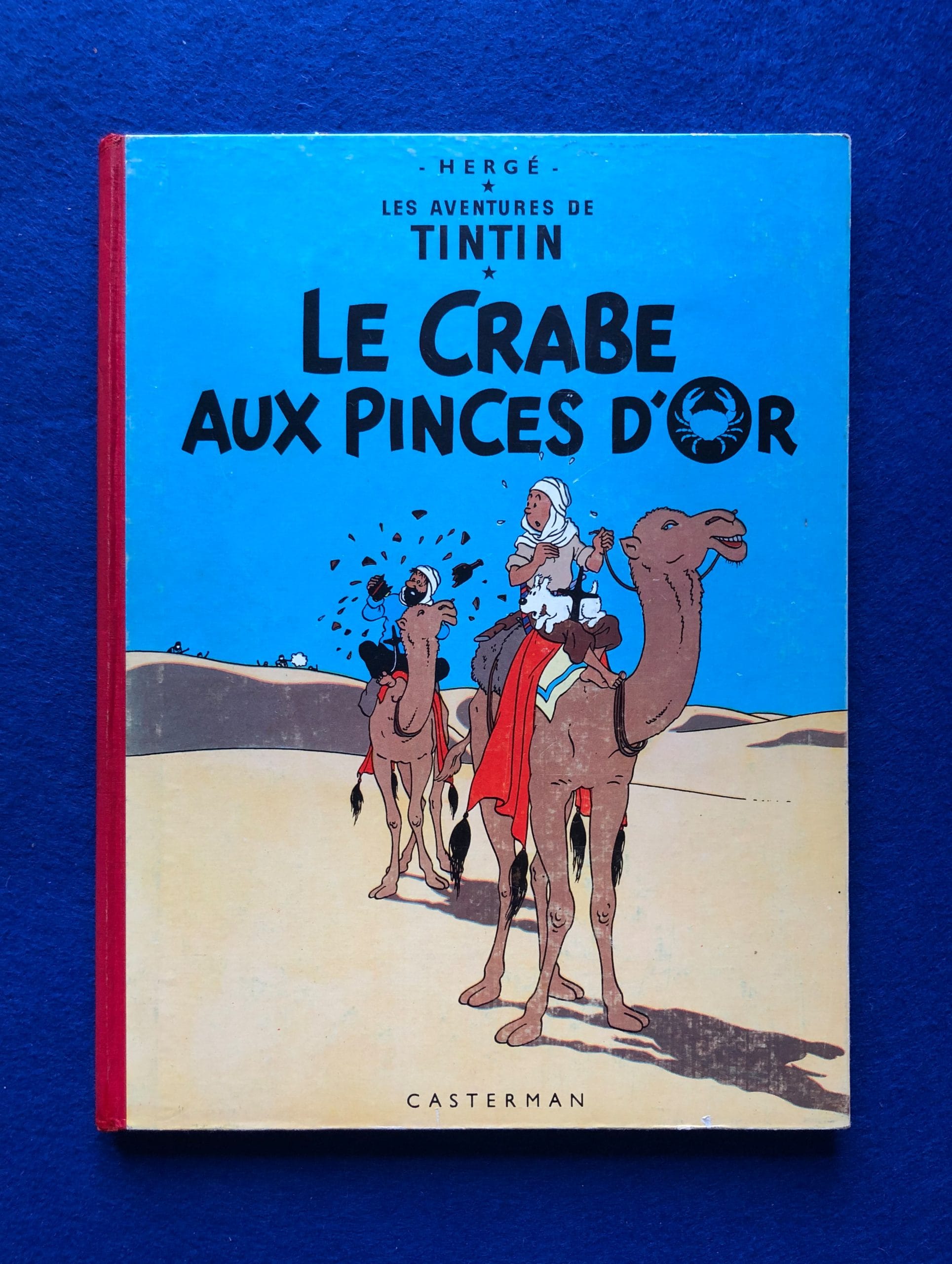 Réédition du Crabe aux Pinces d’Or 1960, 4ème plat B27, dos Rouge, Pages de garde bleu claire, imprimé en Belgique.