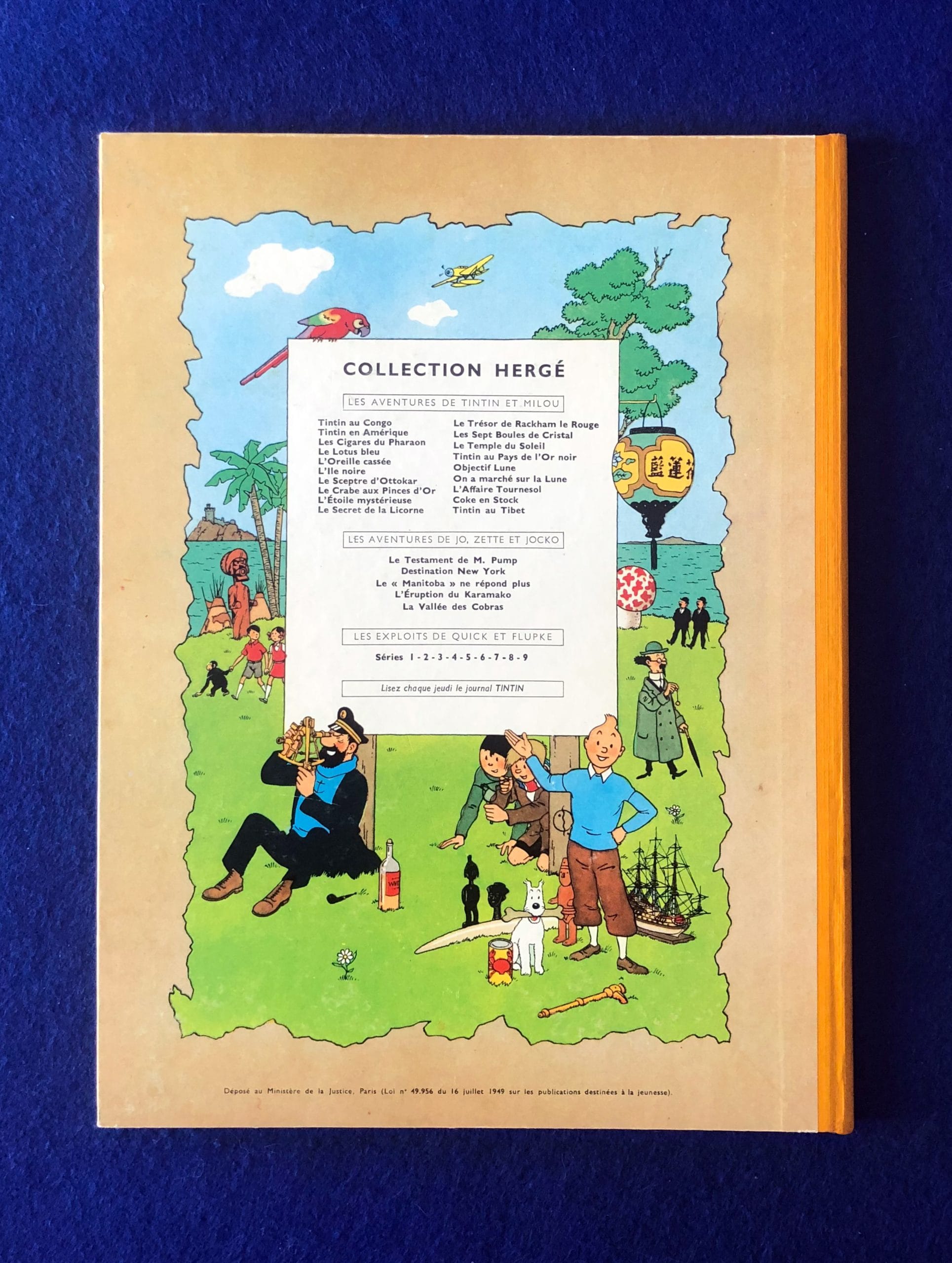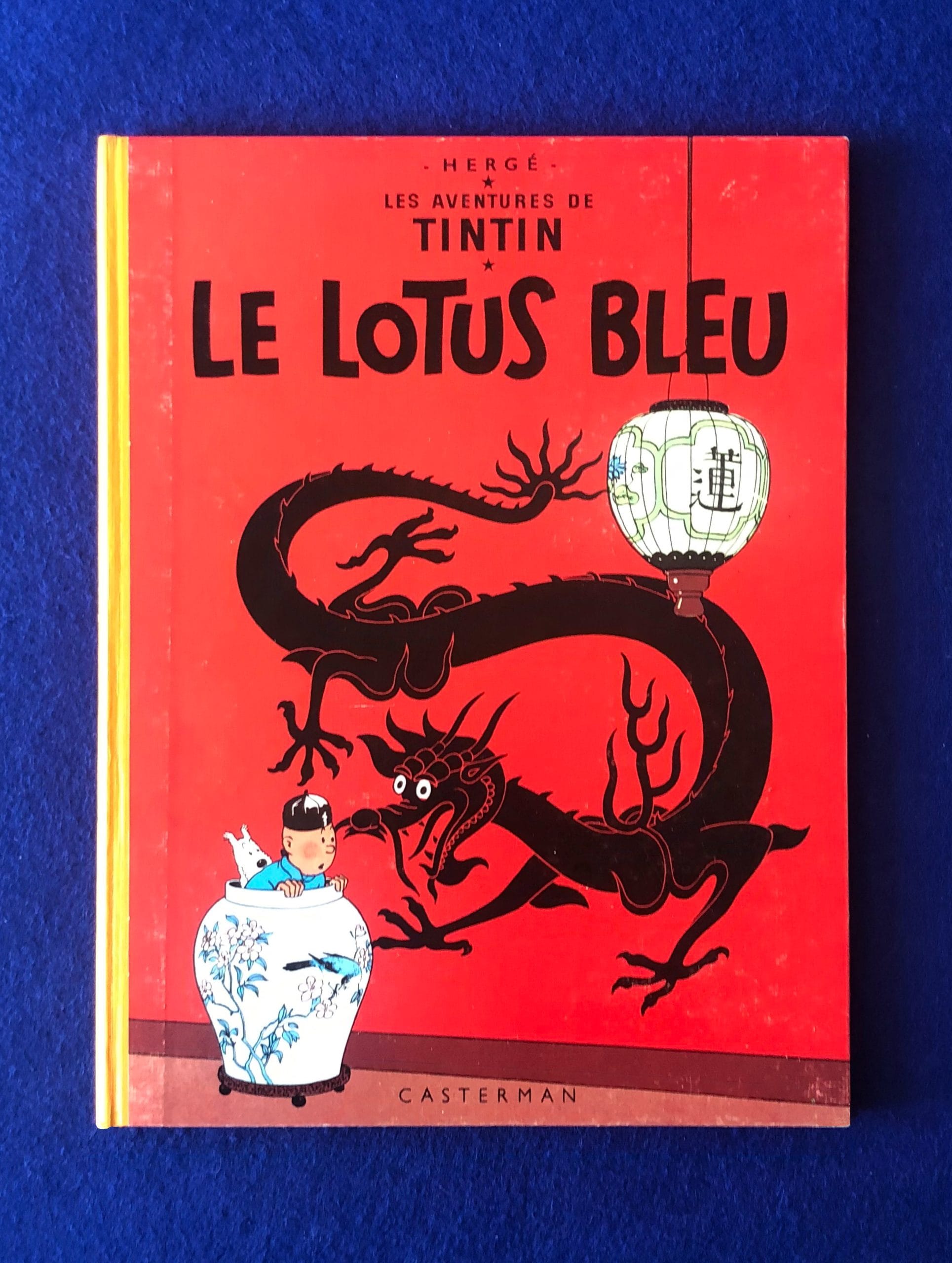Réédition française du Lotus Bleu de 1960, 4ème plat B29, dos Pellior Jaune, Pages de garde bleu clair, imprimé en Belgique.