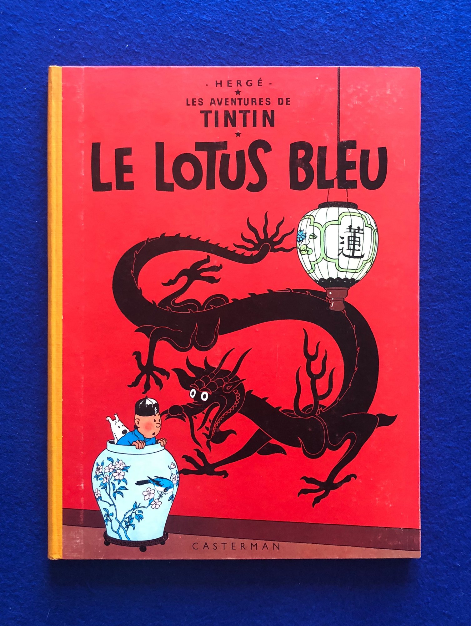 Réédition du Lotus Bleu de 1960, 4ème plat B29, dos Pellior Jaune, Pages de garde bleu clair, imprimé en Belgique.