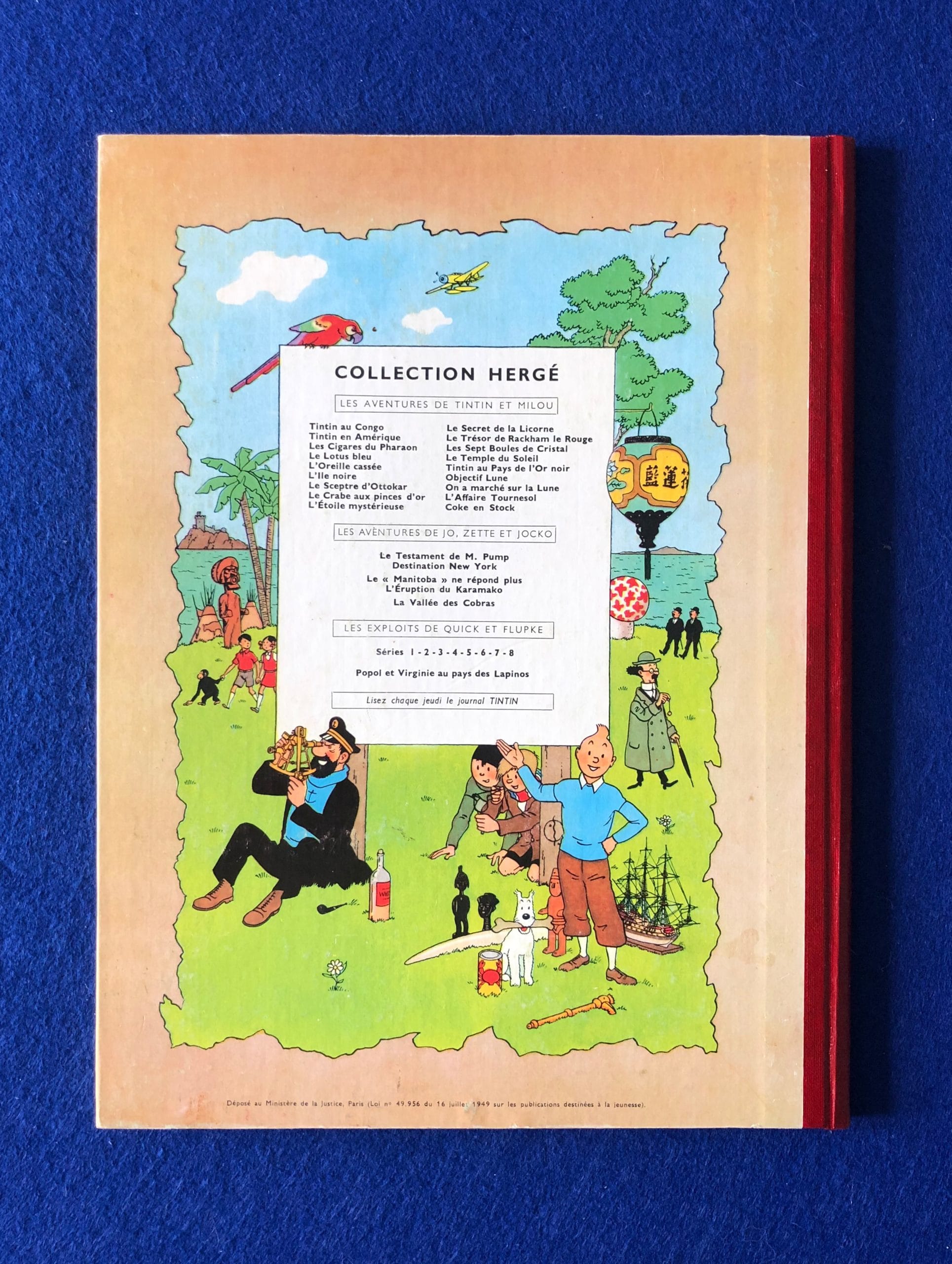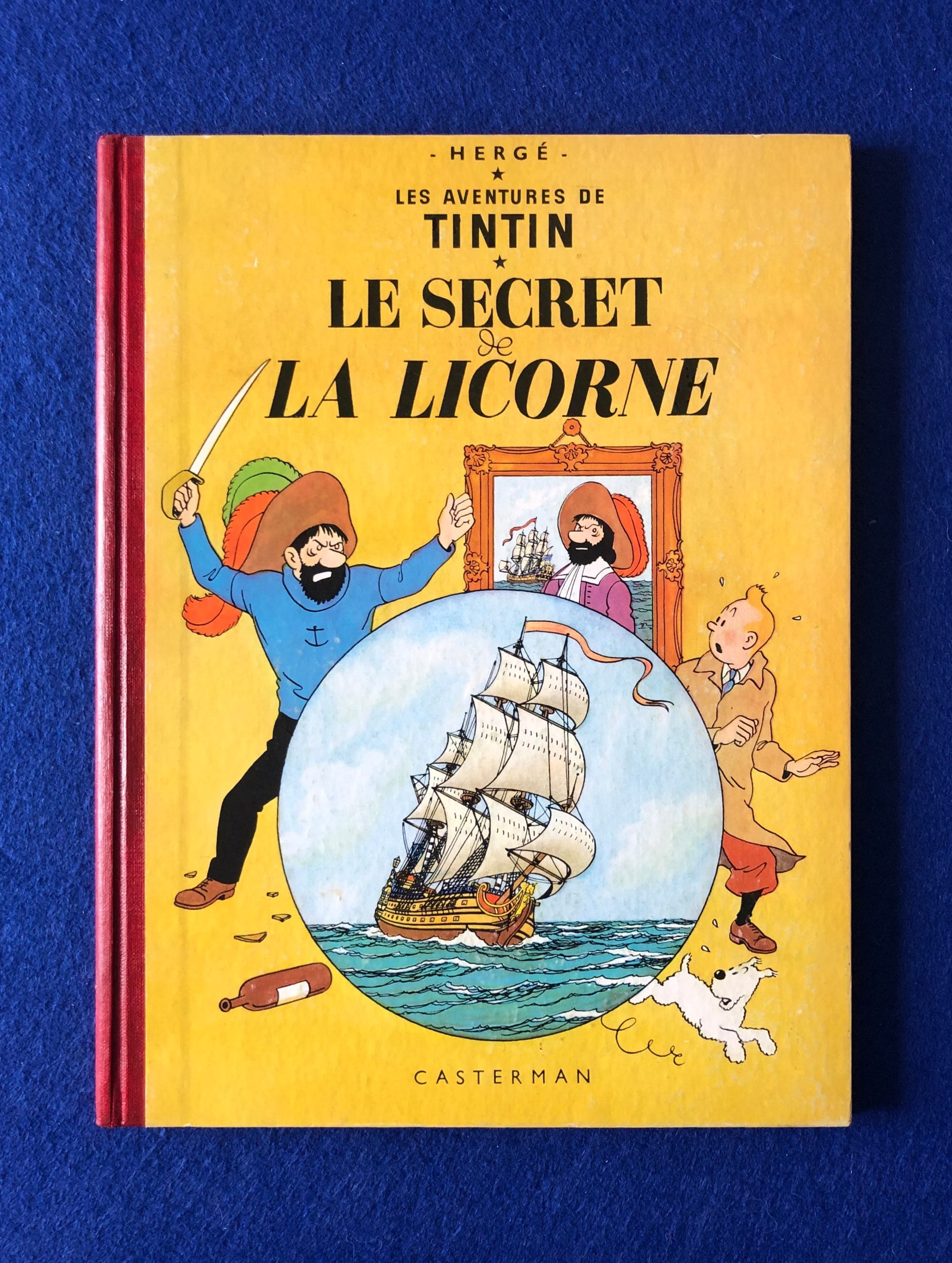 Réédition Française du Secret de la Licorne du 2ème trimestre 1959, 4ème plat B24, dos Pellior Rouge, Pages de garde bleu claire, imprimerie Léonard Danel, n°2023.
