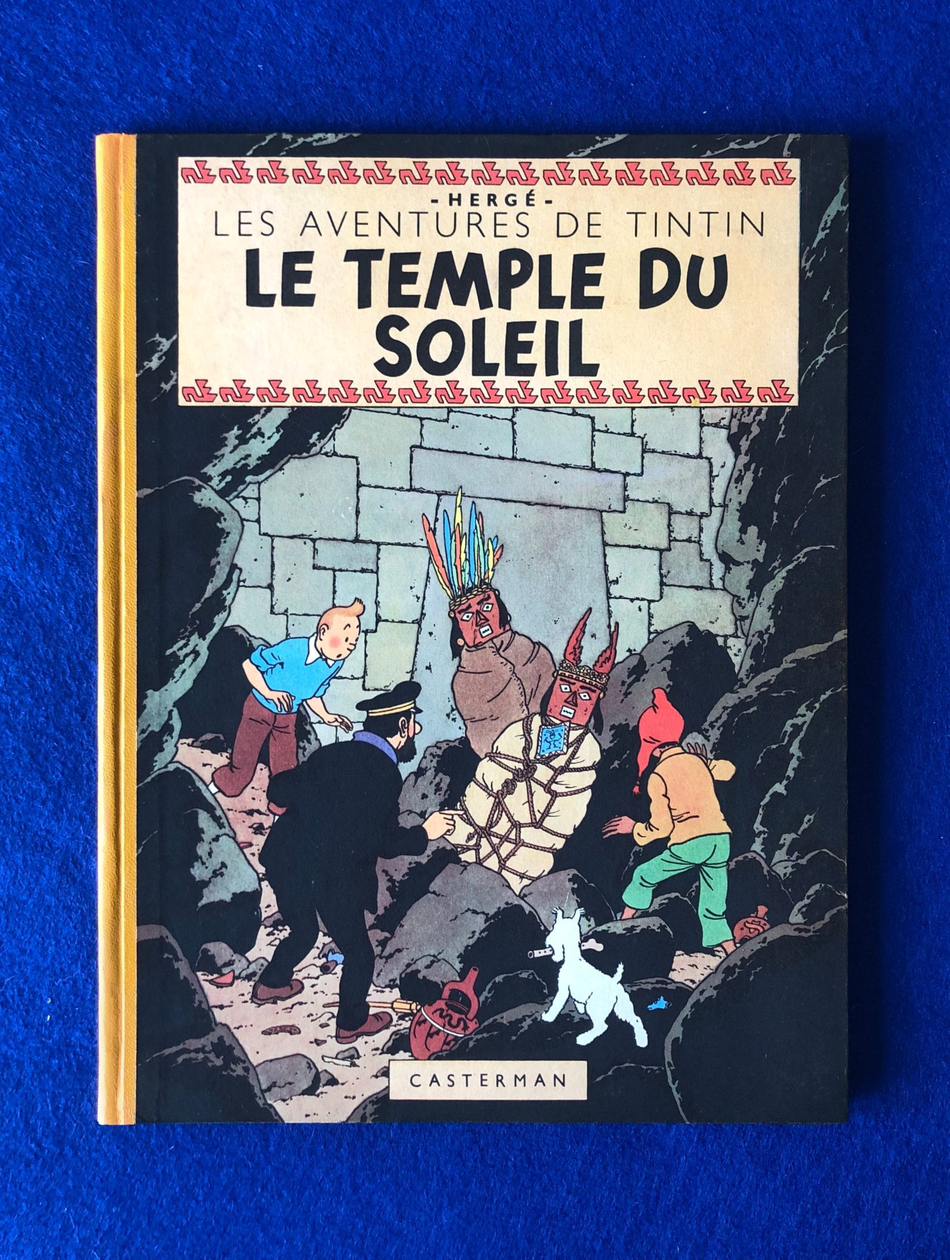 Edition Originale du Temple du Soleil de 1949, 4ème plat B3, Dos pellior jaune, Pages de garde bleu foncé, 2 Symboles Incas à la page de titre.