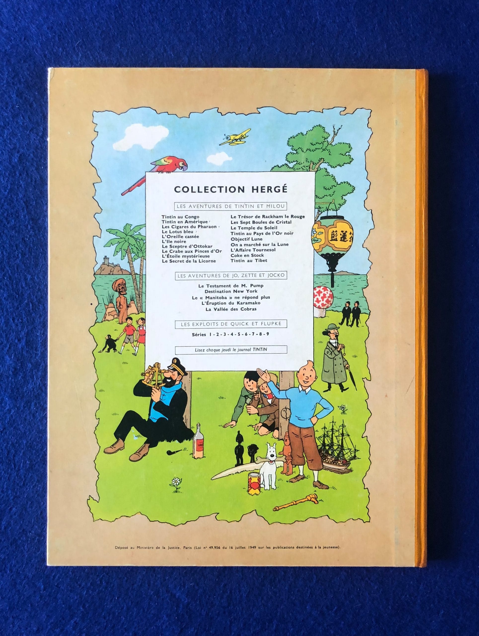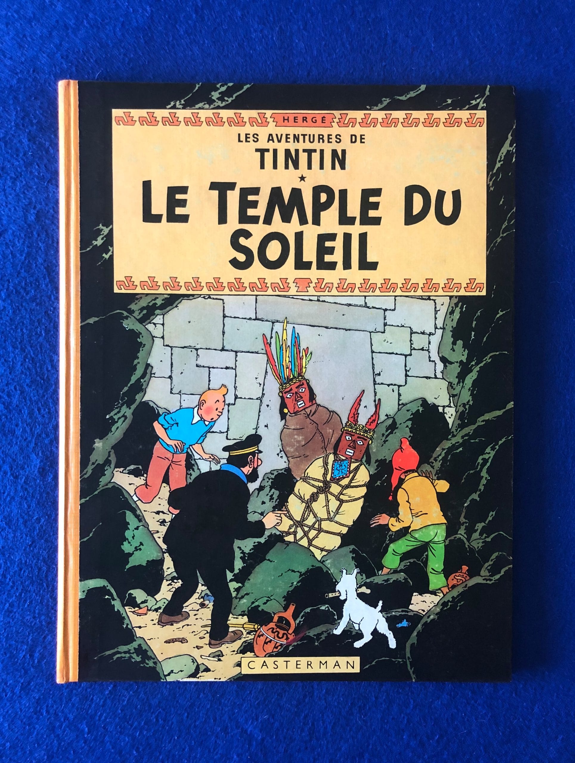 Réédition Belge du Temple du Soleil de 1960, 4ème plat B29, dos Pellior Jaune, Pages de garde bleu clair, imprimé en Belgique.