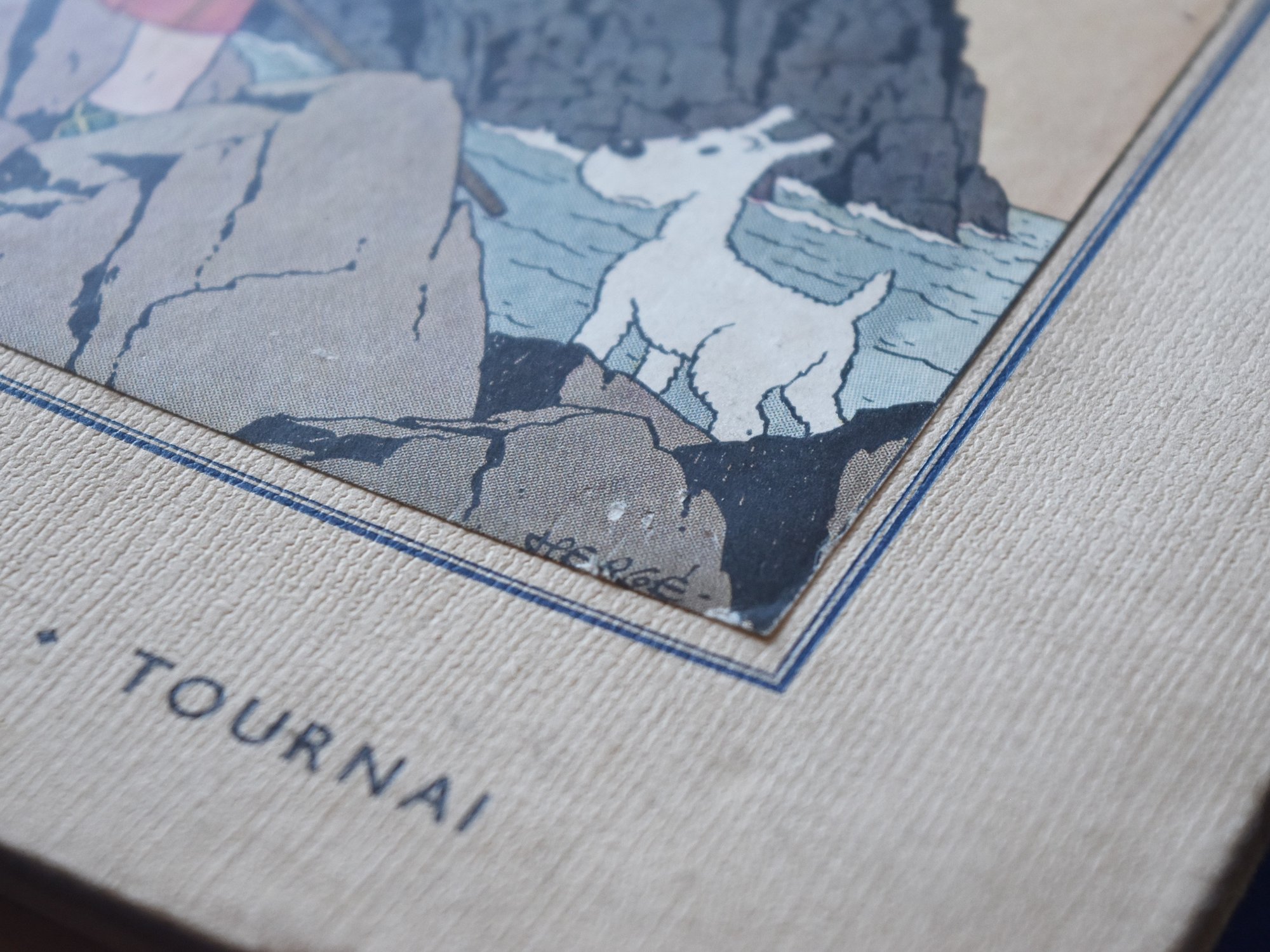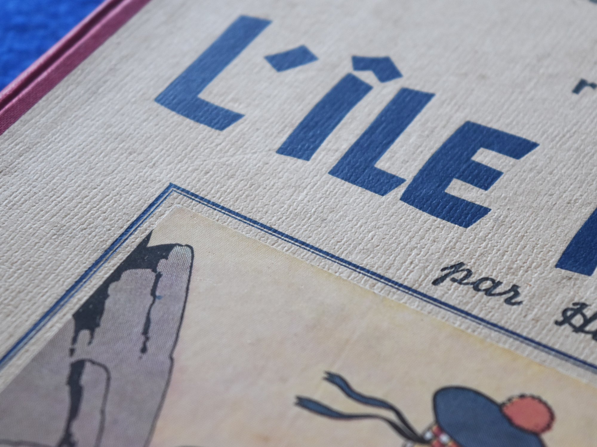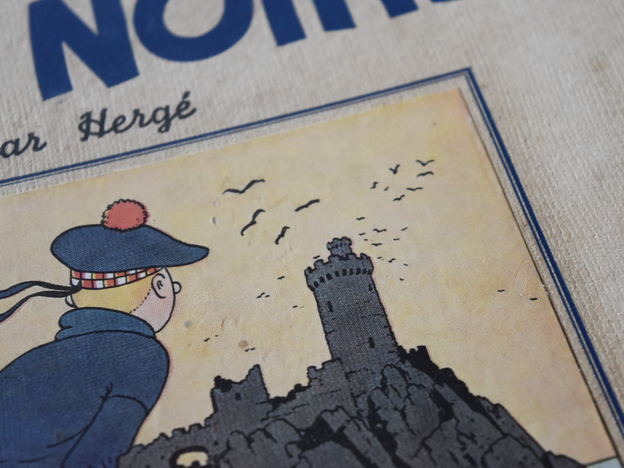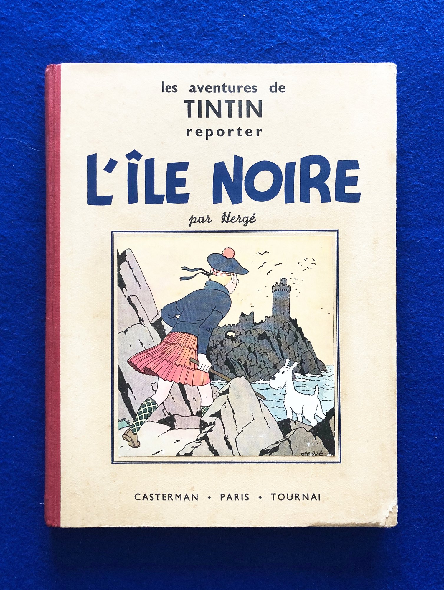 Sublime Réédition de L’Ile Noire de 1938 avec signature de Hergé au 1er plat, 4ème plat A5, dos en tissu Rouge, Pages de garde bleu foncé, Imprimé en Belgique.