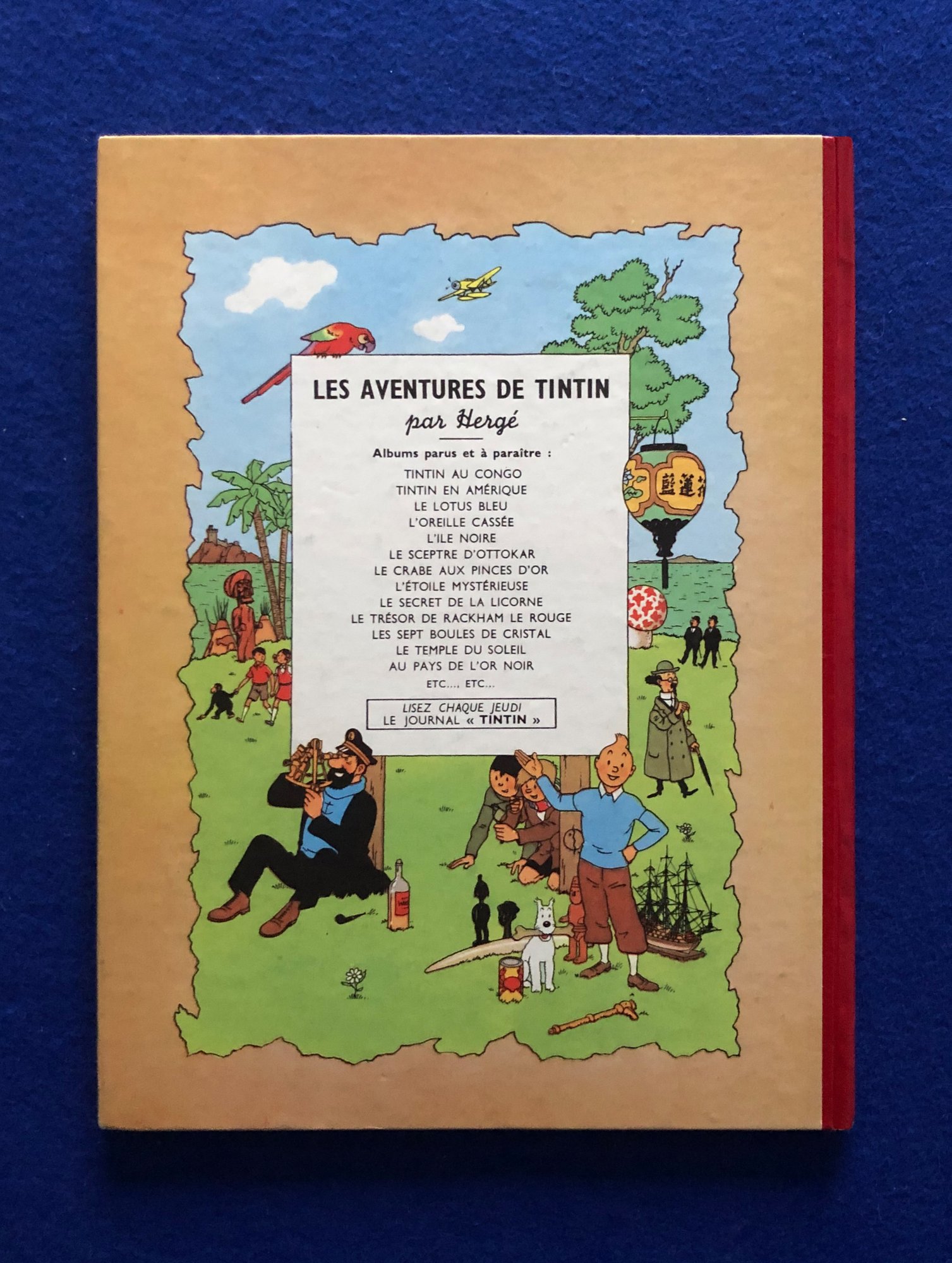 Réédition de Tintin au Congo de 1950, 4ème plat B4, dos Pellior Rouge, Pages de garde bleu Foncé, Imprimé en Belgique.
